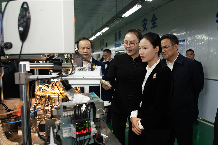 (10月26日,市委副書記、代市長韋朝暉在芷江調研。圖為韋朝暉在湖南華晟電通科技有限公司仔細了解全縣電子元器件產業鏈建設和企業生產經營情況。懷化日報社全媒體記者 吳濤 攝)