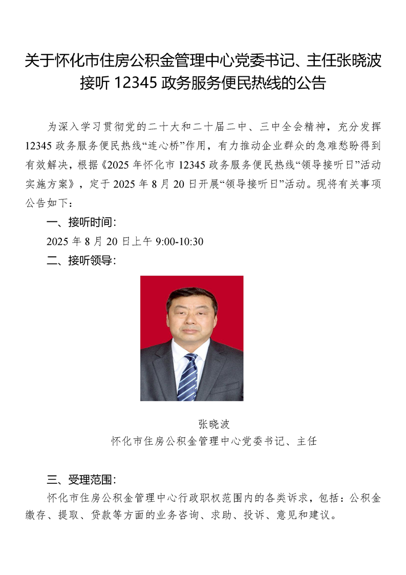 關于懷化市住房公積金管理中心黨委書記、主任張曉波接聽12345政務服務便民熱線的公告