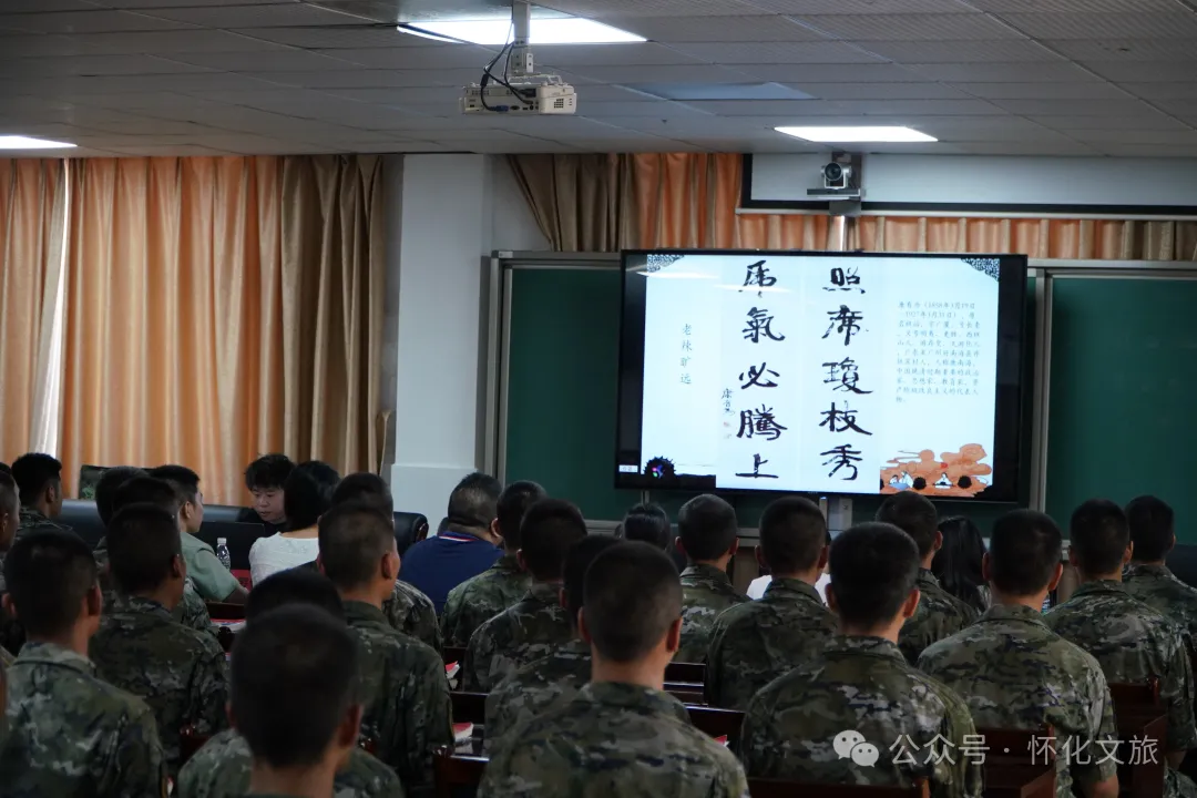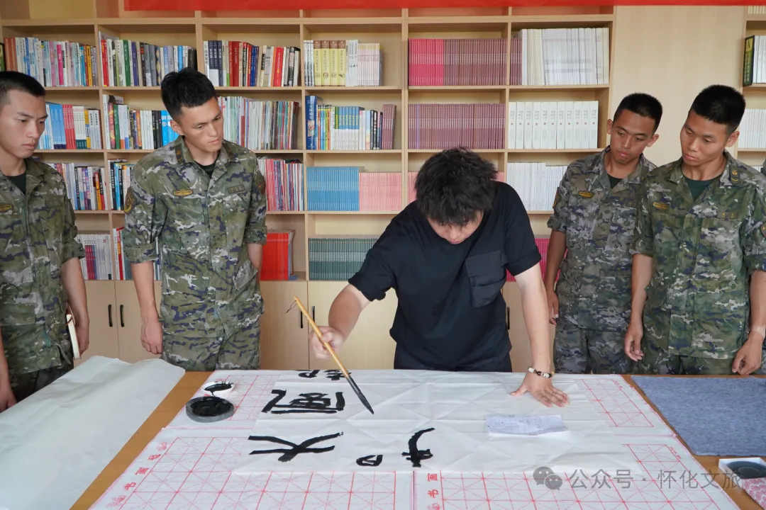 活動現場,懷化市圖書館邀請湖南省青年書法家協會理事、懷化市書法家協會副秘書長張鵬進行授課和交流,在介紹書法的基本知識后,張鵬帶領現場官兵們鑒賞書法作品,并與大家一起進行書法創作,提升大家的文藝創作能力。