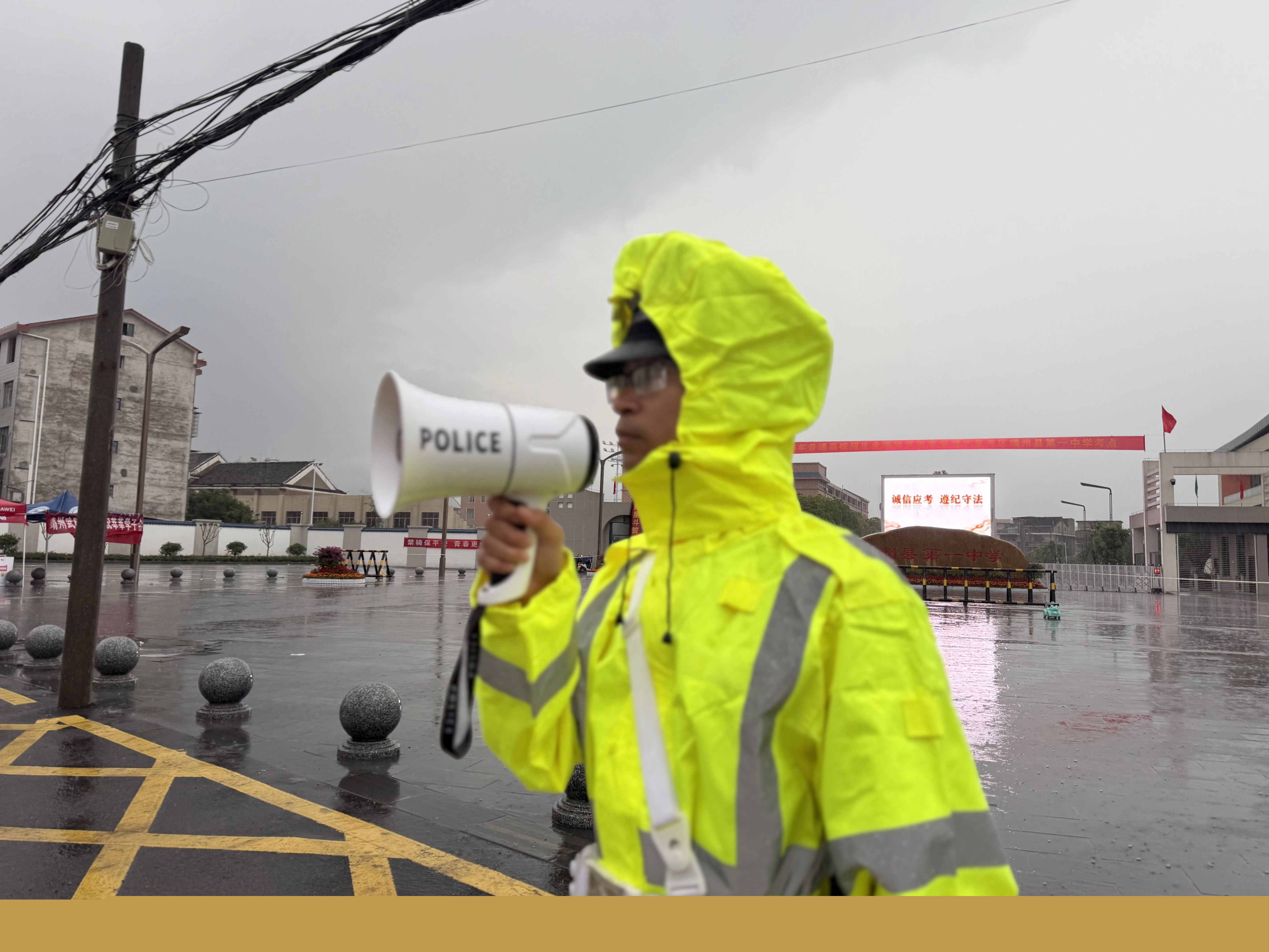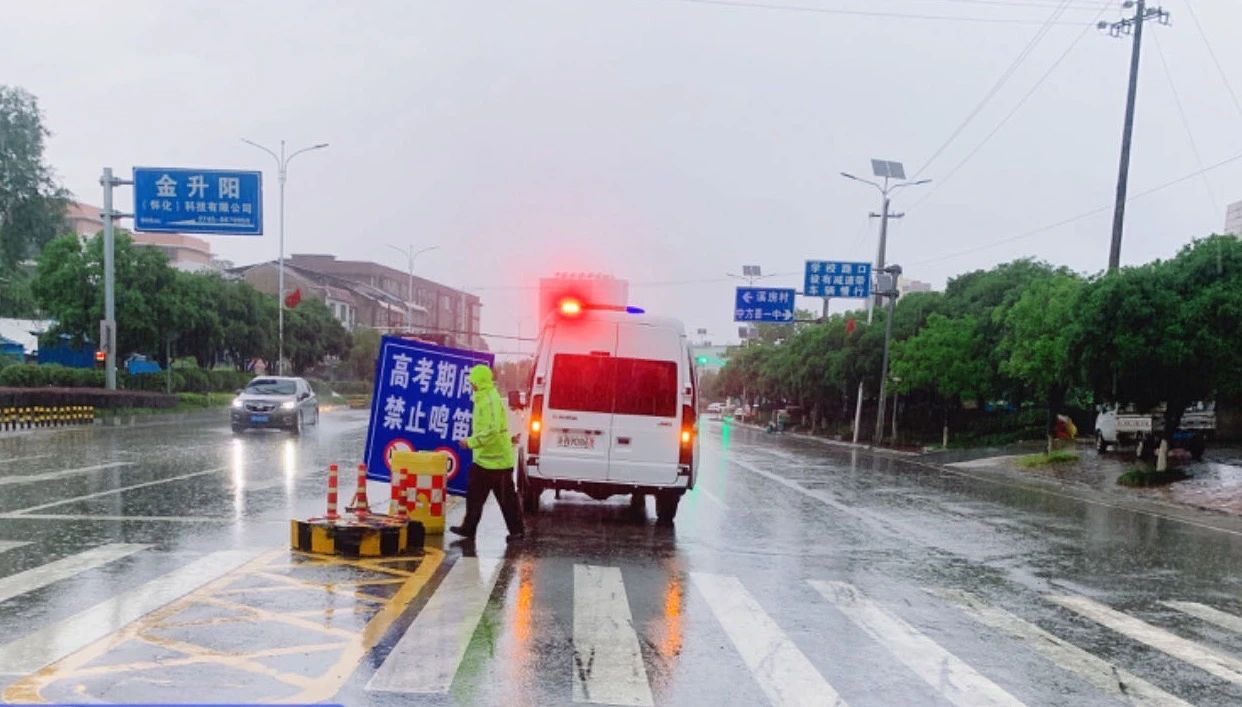 2025年高考期間,我市普降暴雨,這給廣大考生帶來交通不便,為確保考生順利參加考試,懷化公安交警參戰民輔警雨中堅守工作崗位,全力以赴為考生保駕護航。