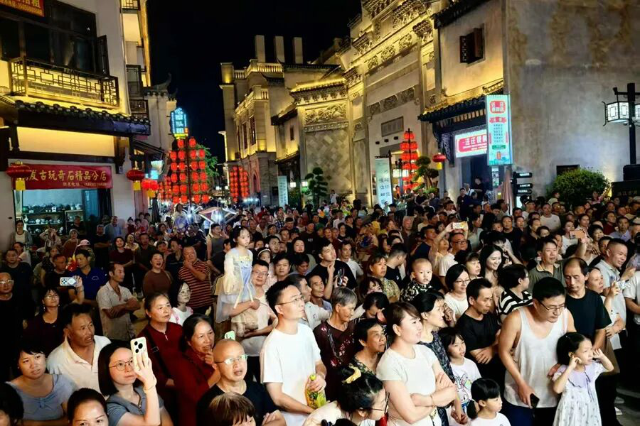 夜幕下的鶴鳴洲景區同樣精彩。晚8時,太平溪畔燈光流轉,觀鶴樓光影靈動,《鶴鳴福地》水幕電影準時開播,現場歡呼聲、驚嘆聲此起彼伏,市民游客舉著手機記錄精彩瞬間,沉浸式感受懷化文旅的獨特魅力。